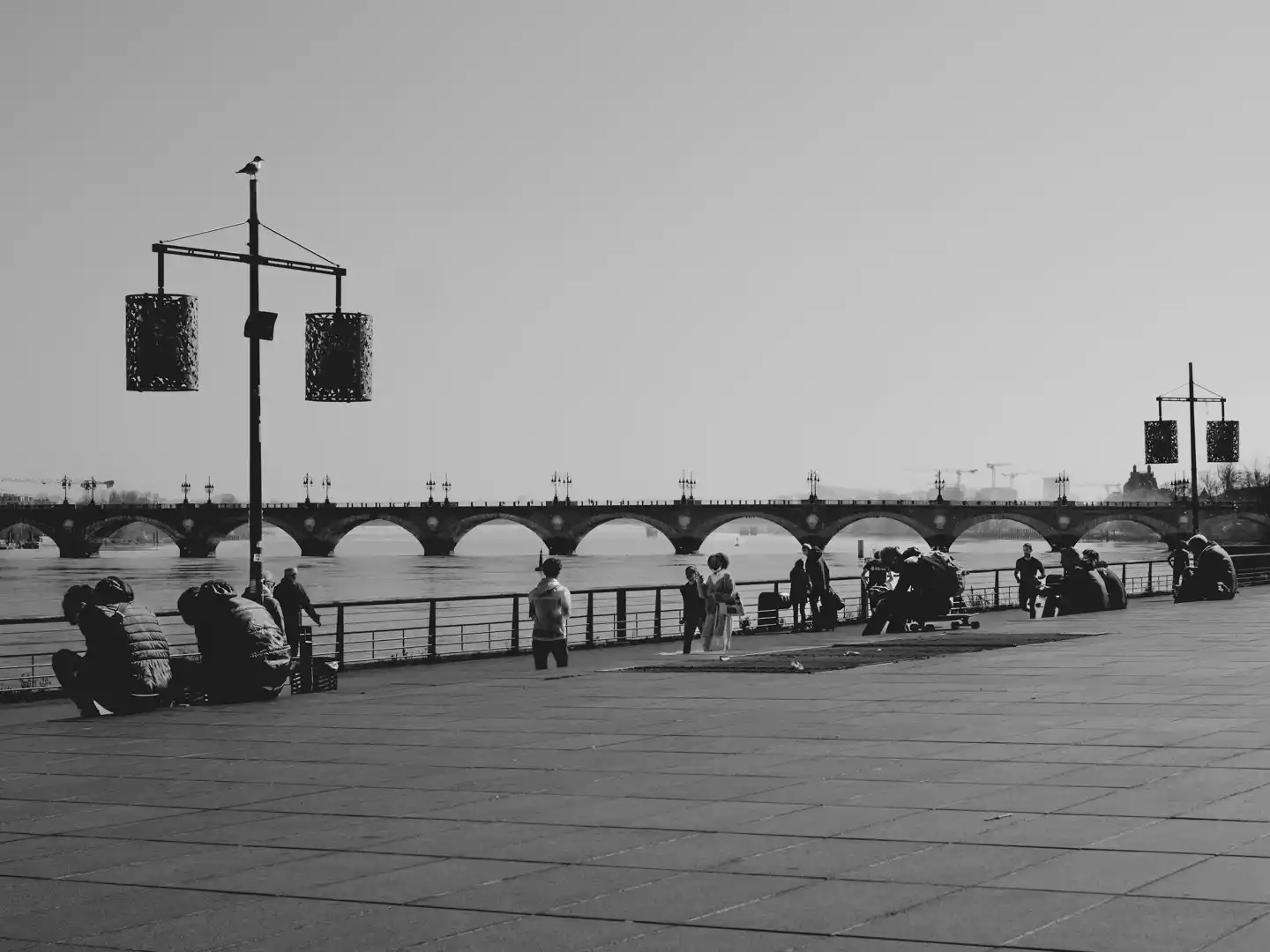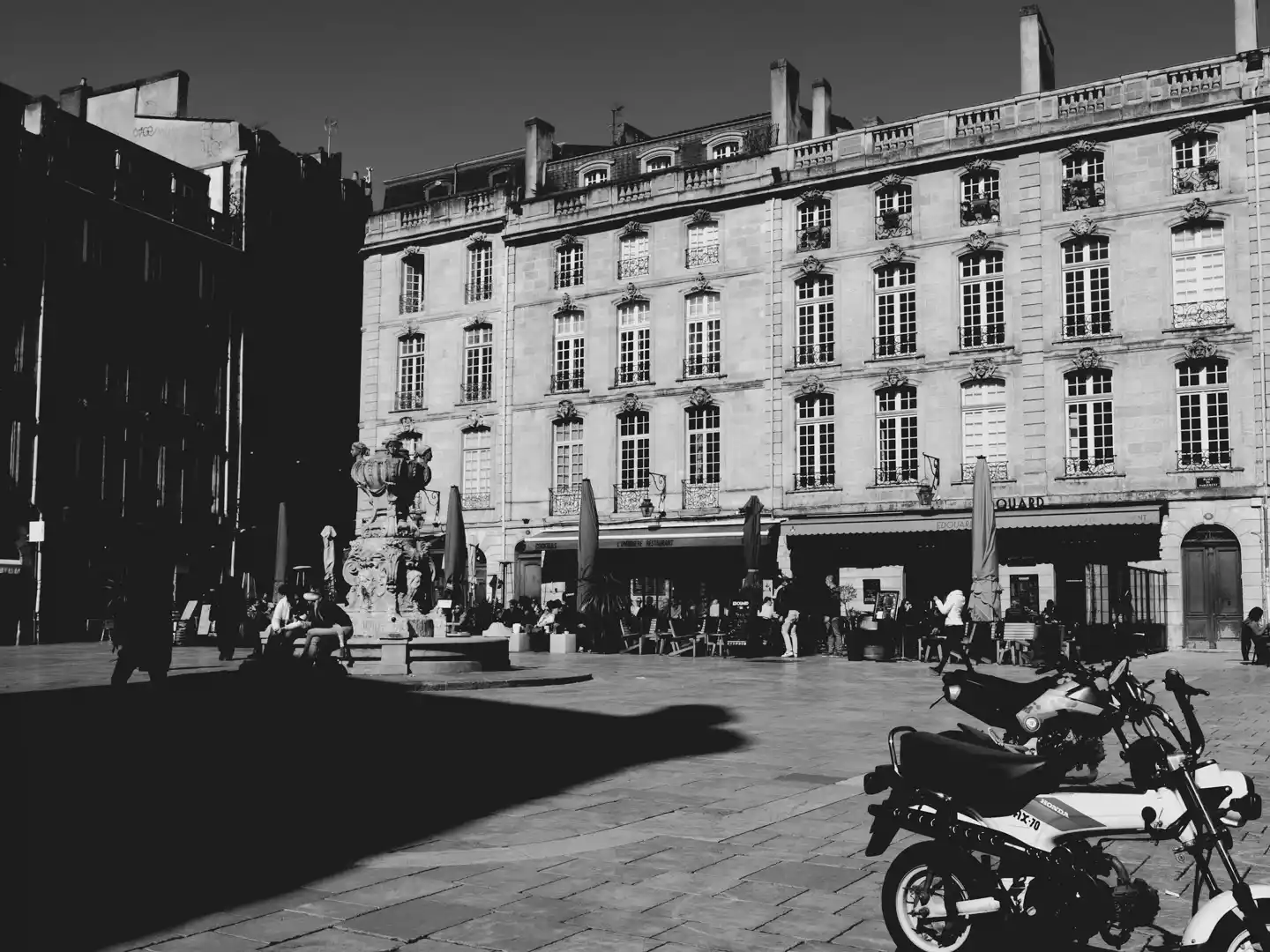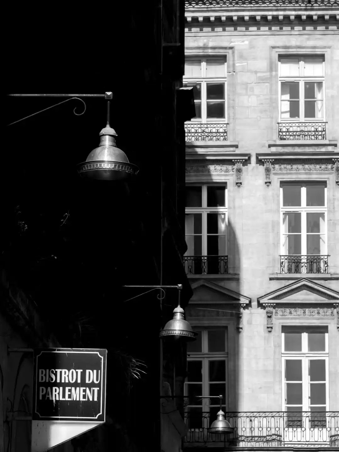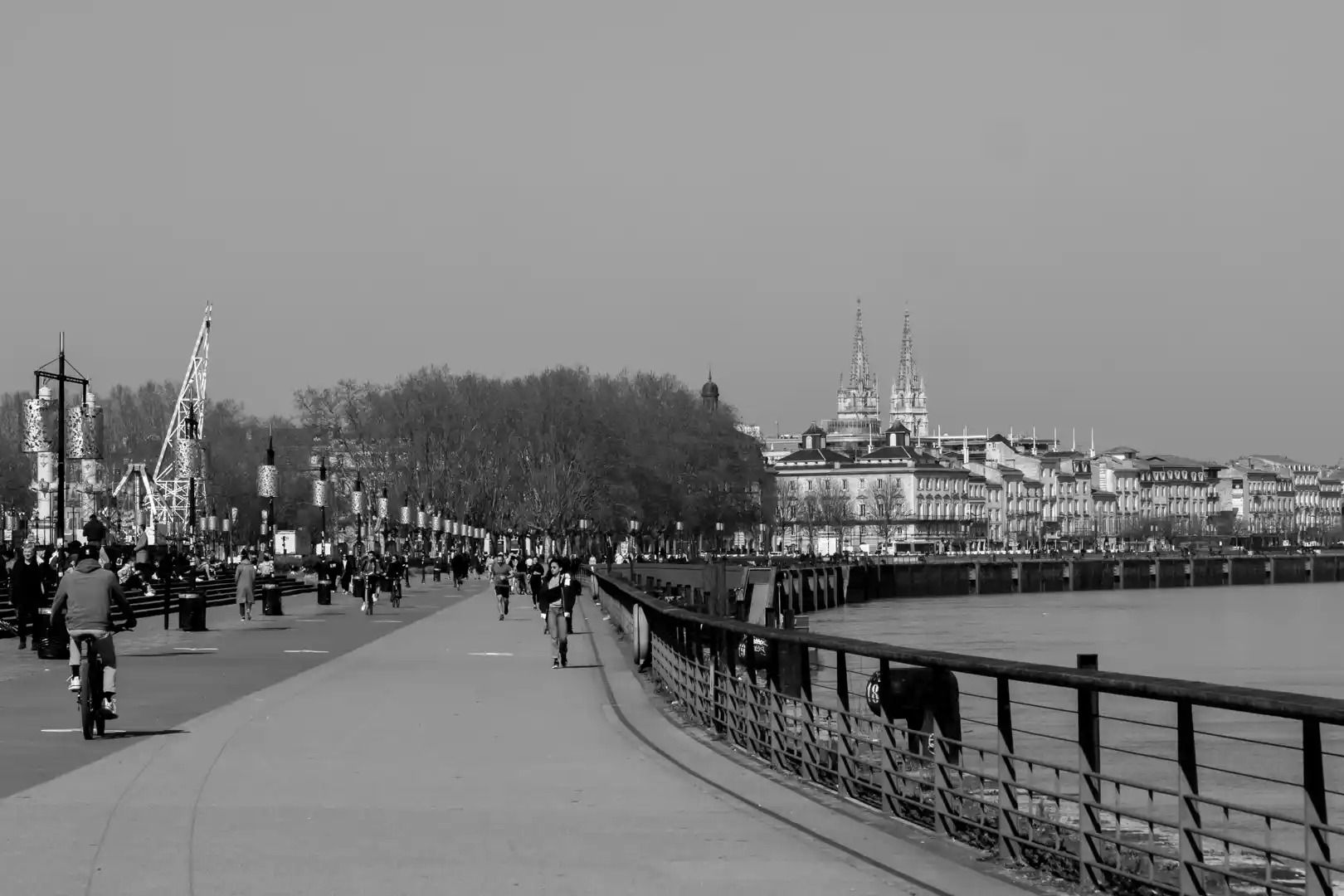 L’étroitesse de certains passages permettent de jouer avec les ombres et lumières, dévoilant des détails architecturaux inédits. Les lignes de tram, comme de nombreuses villes modernes s’intègrent parfaitement au paysage urbain. Le flot de passager, participe à la dynamique du lieu et anime les rues. Joggers, cyclistes et piétons se côtoient sur les quais entre les jardins aménagés pour les personnes plus enclin à la rêverie et la Garonne, massive, proche de son embouchure vers l’océan Atlantique.